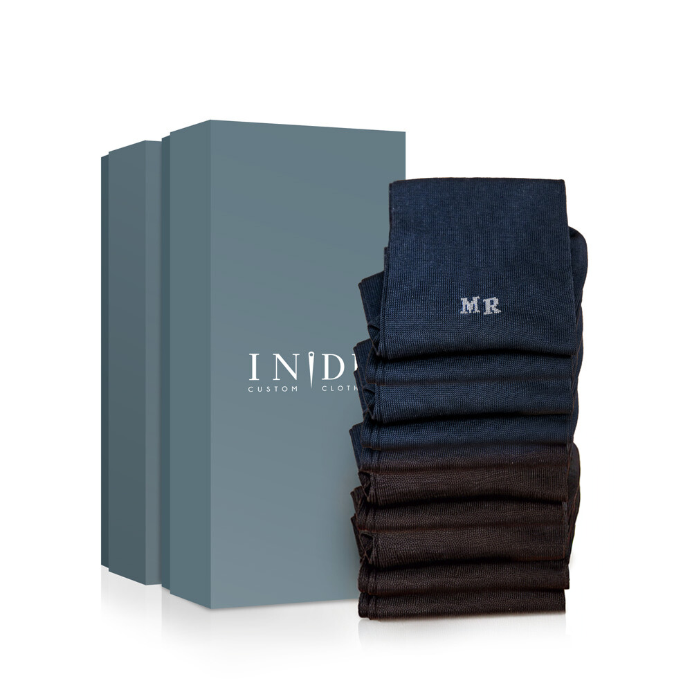 La box bicolore classico ti permette di scegliere 6 o 10 paia divise in due colori diversi. Potrai selezionare due tonalità e ricevere le tue calze personalizzate con iniziali filate.